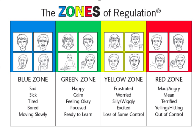 • At Ongar Primary School all classrooms have a ‘Zones of Regulation’ display (see above) which categorises a range of feelings into four colour groups.