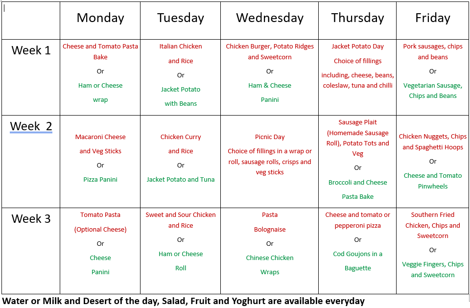 Any changes with regard to school meals will be mentioned in the weekly newsletter.